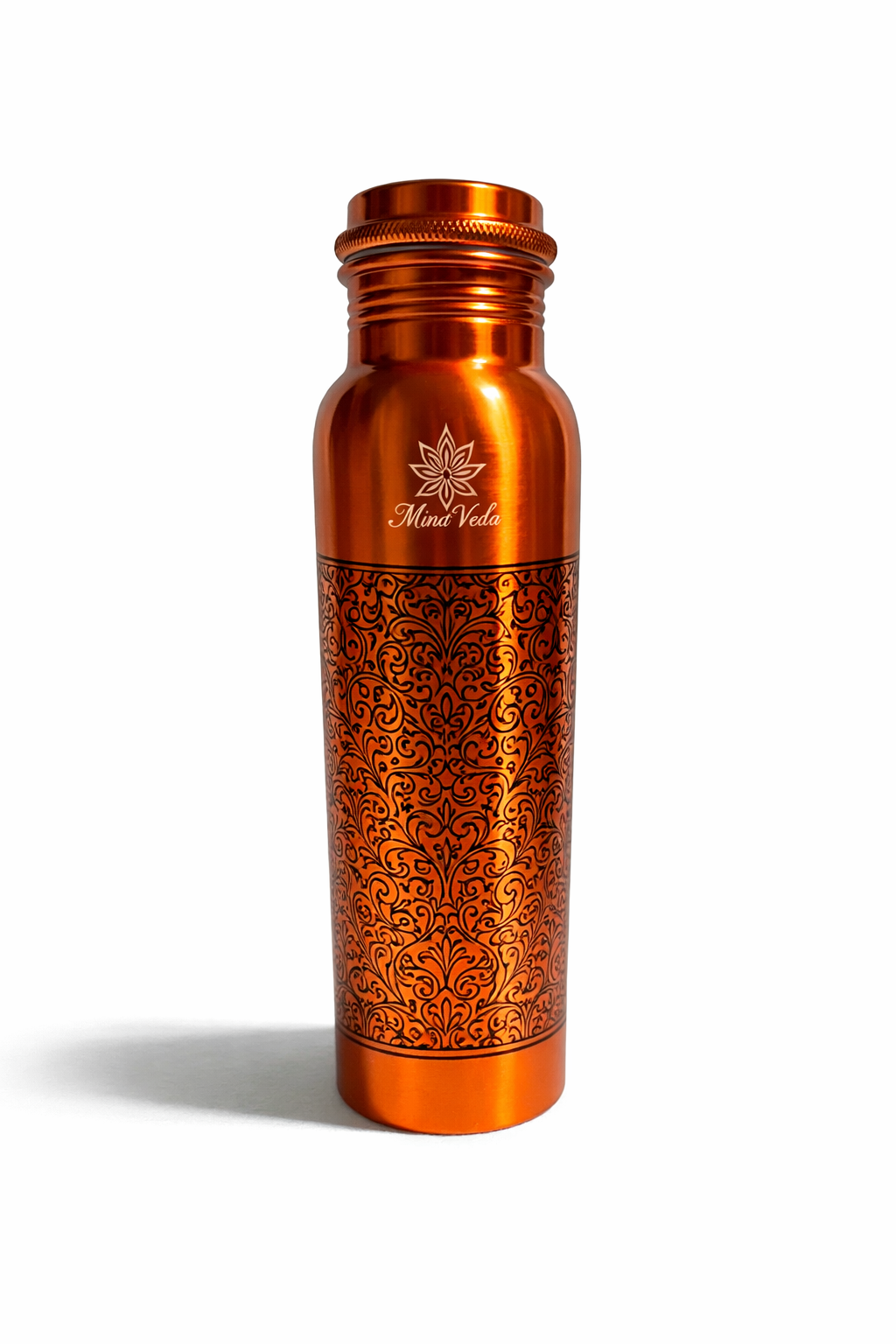 This 1 liter antique etching copper bottle is crafted from pure copper and finished with detailed traditional etching for a timeless, handcrafted look. The warm antique tone and engraved patterns reflect classic Ayurvedic design while keeping the bottle practical for everyday use.